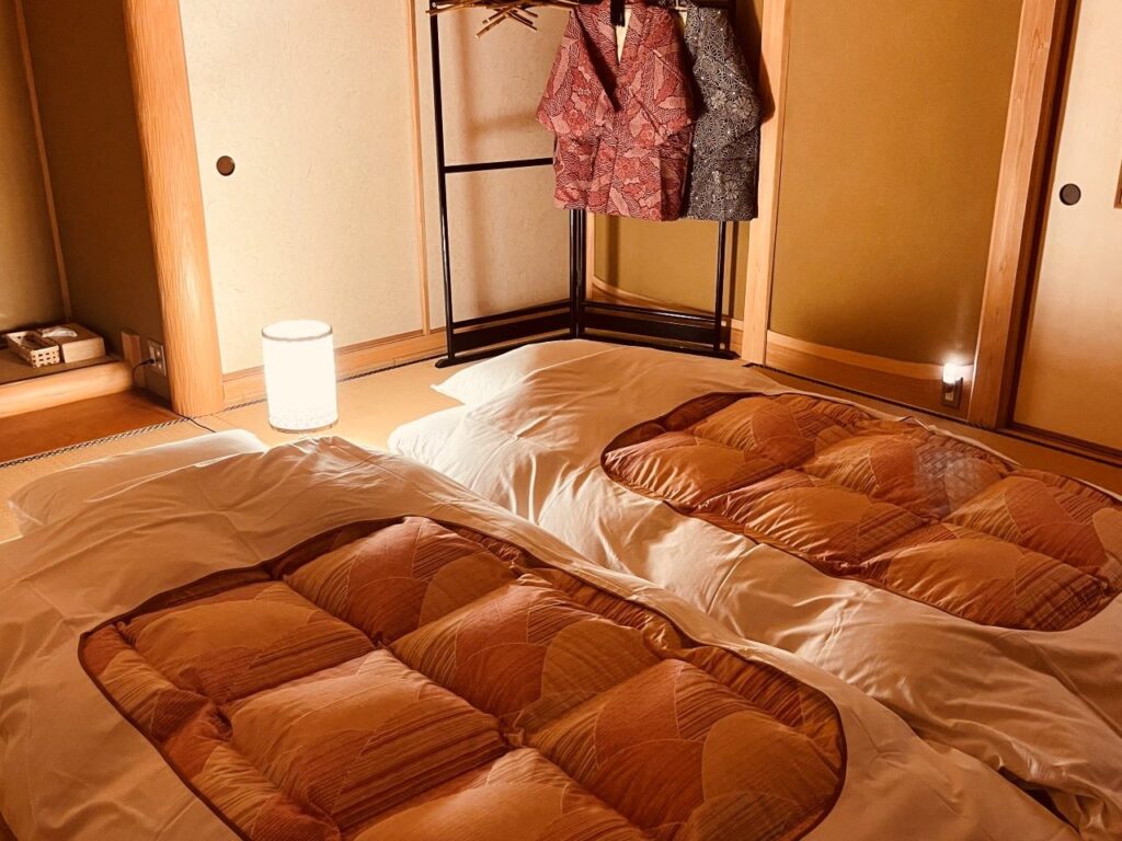 In the tatami-floored Japanese room, futons are prepared for each guest, offering a level of comfort comparable to a mattress bed and highly praised by our guests.