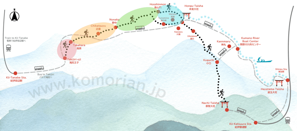 구마노고도를 걷는 전통적인 방식은, 길을 따라 여러 숙소를 예약하고 매일 다음 숙소까지 걸어서 이동하는 것입니다.